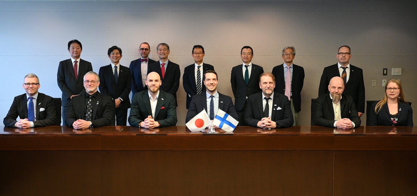 On April 26, the NYK Group welcomed Jouni Ovaska, chair of Finland’s Transport and Communications Committee, and nine members of the Finnish parliament to the NYK head office in Tokyo. NYK was represented by Nobuhiro Kashima, senior managing executive officer; Tomoyuki Koyama, president and representative director of Group company Japan Marine Science Inc.; and Hideki Suzuki, president and representative director of Group company MTI Co., Ltd.