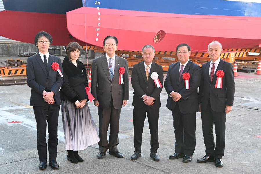 The ceremony was attended by many stakeholders, including Masato Yamada, CEO of JERA Nex bp Japan LLC; Takuya Tasso, governor of Iwate Prefecture; and Kyo Ono, mayor of Kamaishi City. NYK President Takaya Soga officially named the vessel “Alfonsino Arrow.”