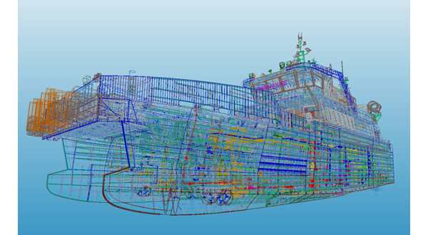 During the construction phase, the vessel was built using the design-stage 3D model. In addition, 3D scanning of the actual structure was conducted during construction to visualize deviations from the design data.