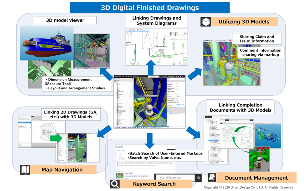 By using the 3D model as an entry point, users can intuitively access related equipment and documentation, which is expected to improve efficiency in vessel management operations such as inspections and maintenance after the vessel enters service.