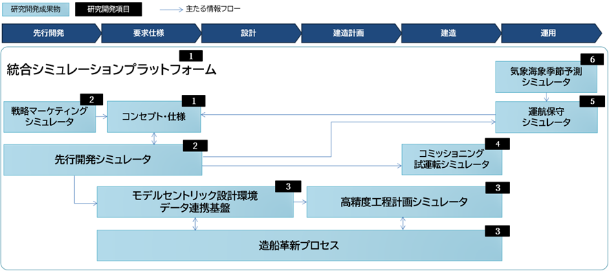 船舶に対する環境対応への要求が高度化、複雑化していく中、労働人口減少と需要拡大に対応するための方策も必要となっています。本研究開発課題では高性能次世代船舶を短期間に開発・供給する能力を獲得すべく、初期の開発、設計段階で、建造、運用のライフサイクルとサプライチェーンを同時並行的に考慮して本船仕様、建造計画を最適化する「統合シミュレーション・プラットフォーム」を構築し、海事産業へのバーチャル・エンジニアリングの導入を推進します。また、船舶の安全な運用に影響を与える気象・海象の予測についても、台風などの極端現象を含む1~3カ月先までの季節予測技術を確立し、プラットフォームに組み込みます。