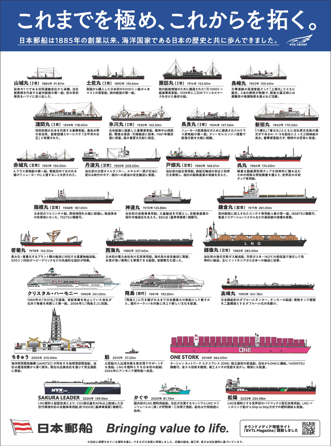 この全面広告のデザインでは、当社グループの歴史を語る上で欠かせない27隻を厳選し、竣工年順に並べた同一縮尺のイラストを用いて、各船の外観を可能な限り忠実に再現しました。このデザインで「これまでを極めてきた船舶」から「これからを拓く船舶」へと繋がる歴史を感じとって頂けると幸いです。