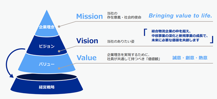 ミッション(企業理念)、ビジョン、バリュー。当社グループ社員が同じ方向を向いて社会に価値を提供していくための道しるべであるMVVと経営戦略を図のように位置づけている。