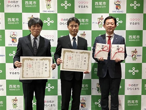 写真左から旭運輸株式会社取締役執行役員 多昌啓、当社名古屋支店長代理 髙木政一、西尾市長 中村健氏