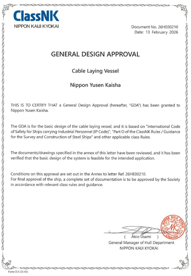 当社は2月13日、国内における長距離海底直流送電網の整備に向けて開発を進めているケーブル敷設船(以下「本船」)の基本設計を完了させ、一般財団法人日本海事協会(以下「ClassNK」)からGeneral Design Approval(以下「GDA」)(注)を取得しました。