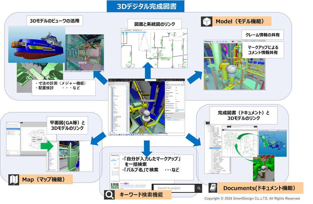 本プロジェクトでは、仕様書や図面、建造時のコメント、実測情報などを3Dモデルと連携させ一元管理する3Dデジタル完成図書を整備しました。この完成図書は、3Dモデルを起点に機器や図書情報を直感的に確認できるため、就航後の点検やメンテナンスなど船舶管理業務の効率化が期待されます。