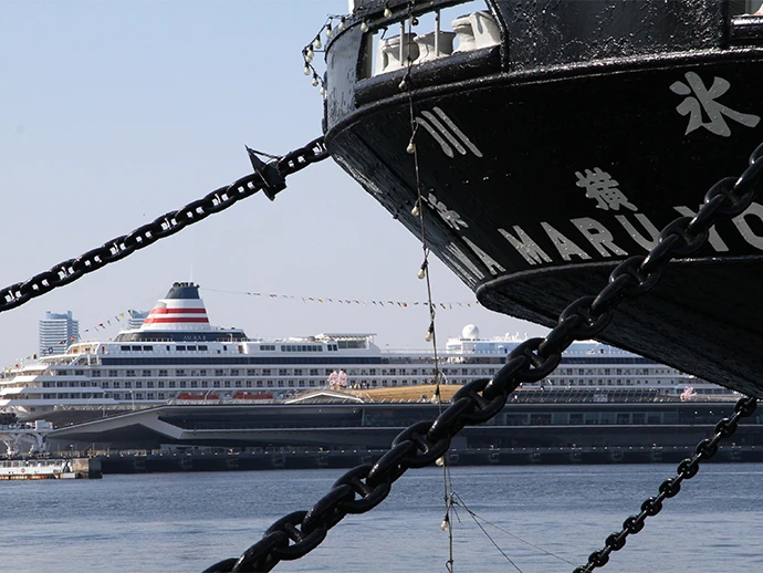 港町・横浜の魅力を発信し続ける臨海エリア、その景観の一部をなす大さん橋(横浜港大さん橋国際客船ターミナル)から、一隻の大きな客船が出航していきます。その名は「飛鳥Ⅱ」。日本郵船グループの郵船クルーズ(株)が運航している外航クルーズ客船です。煙突の赤い2本線「二引」は日本郵船グループのファンネルマーク(船の目印)です。岸壁をゆっくりと離れ、海原へと滑るように進んでいきます。すると……。