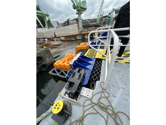 船首には伸縮性に優れた特殊な大型フェンダー(防舷材)が取り付けられています。大型フェンダーが風車設備に接舷する際の衝撃を吸収すると同時に、摩擦力により船体を安定させ、作業員がCTVから風車へ、風車からCTVへと安全に乗り移れるよう配慮しています。